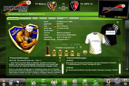 Bei Goal United 2011 bekommst du es mit einem Fußball Manager der Extraklasse zu tun. Übernehme deine eigene Mannschaft und führe sie in die erste Liga. Gewinne mit ihr alle Pokale und setze dich gegen zahlreiche Gegner durch. Bei Goal United 2011 hast du es mit einer besonders großen Community zu tun. Die Fußballmanager Simulation ist nämlich nicht nur in Deutschland bekannt. Auch in vielen anderen Ländern wird Goal United 2011 angeboten, sodass du es mit besonders vielen Gegnern zu tun bekommst. Worauf wartest du also noch? Wähle noch heute deinen Verein aus und starte mit ihm so richtig durch! Features: